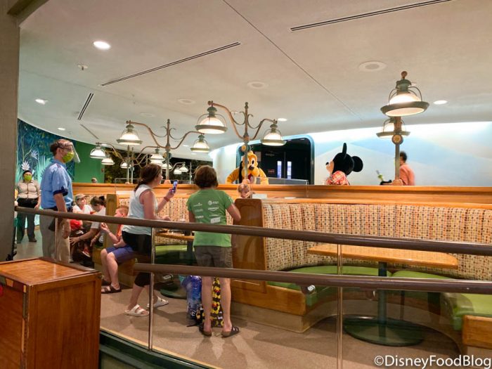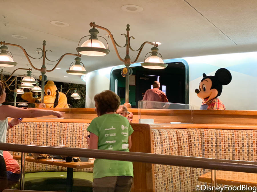 We noticed for now, guests are only being seated on the lower level because the characters are using the upper level to greet with guests from a distance. It’s rather genius!