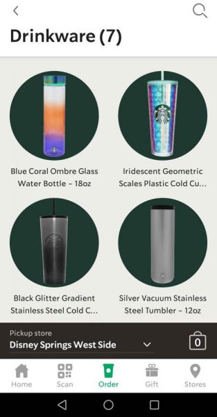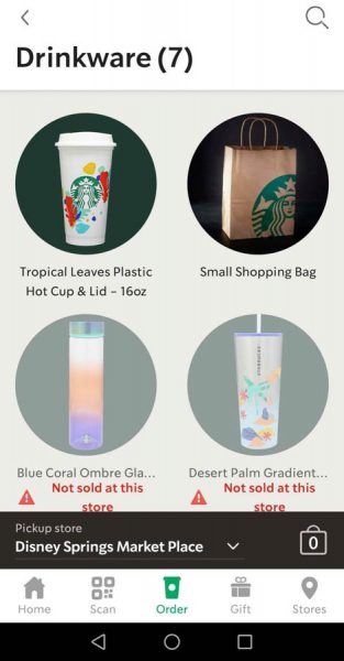 But check out what we found on the Starbucks mobile order app today — they’ve added their popular drinkware to their mobile order menu! Cups were showing up at both Disney Springs’ Starbucks locations earlier today, but right now they only to be available at the West Side location! Here’s what was in stock at the Market Place Starbuck this morning before it disappeared — we’ll keep checking back to see if they replenish their stock!