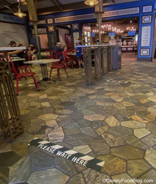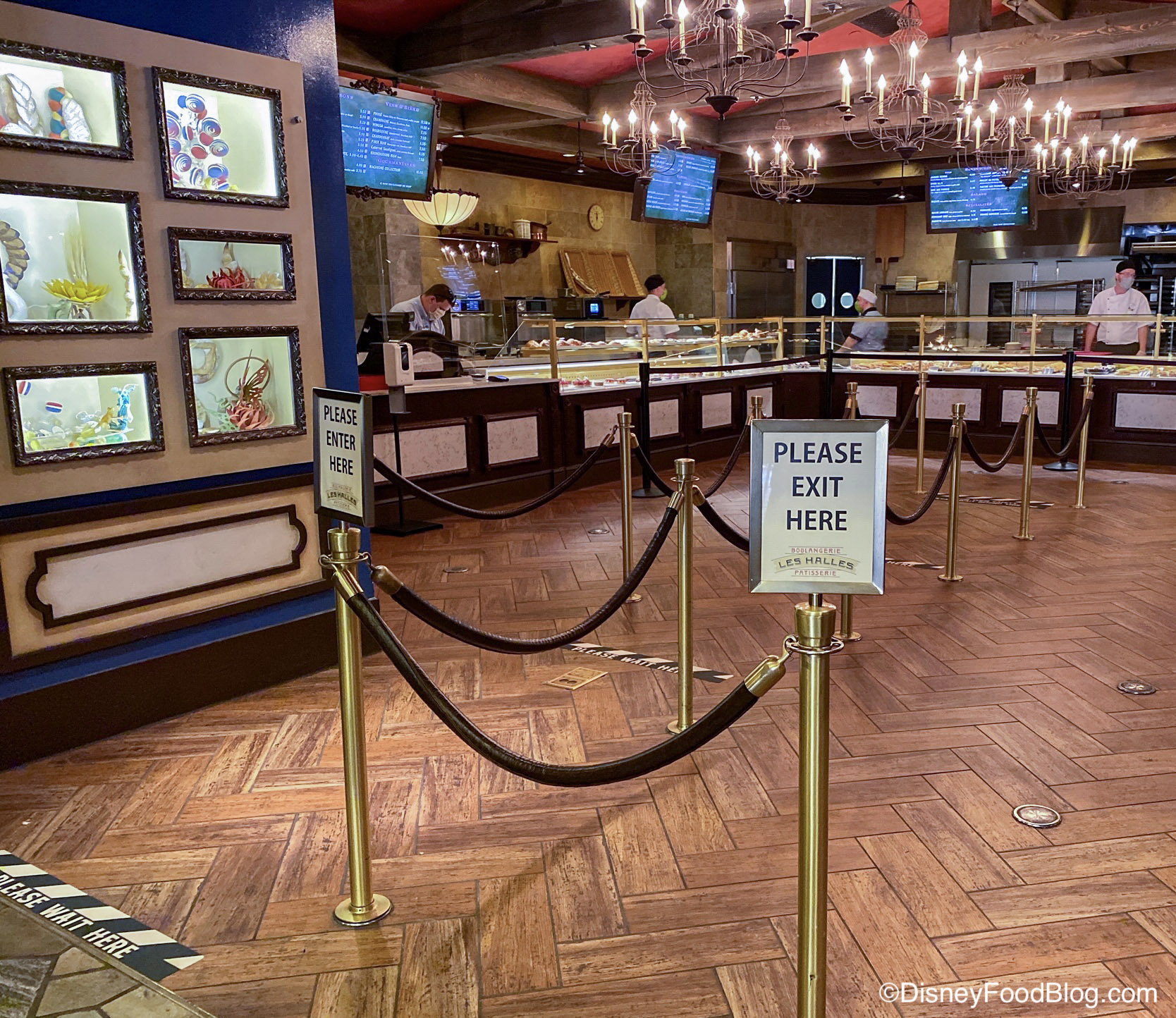 To maintain guest safety, there are now social distancing markers in the gift shop leading all the way into the entrance area to Les Halles.