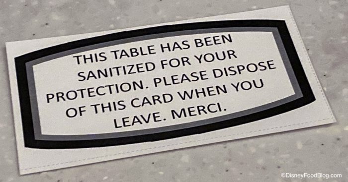 When we stepped out into the seating area, we noticed these sanitization signs on the tables. As the signs indicate, the tables are sanitized for guest safety and protection. When you finish your meal and leave your table, you are asked to throw away the sanitization card so that cast members can clearly see which tables are in need of being sanitized before a new set of guests can sit there.