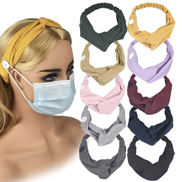 This next one might be the cutest face mask accessory we’ve ever seen — and the most practical! What’s even better than clipping a mask behind your head instead of behind your ears? Not having to rely on the elastics pulling on you at all! We didn’t think it was possible until we saw these ADORABLE Headbands with Mask Buttons.