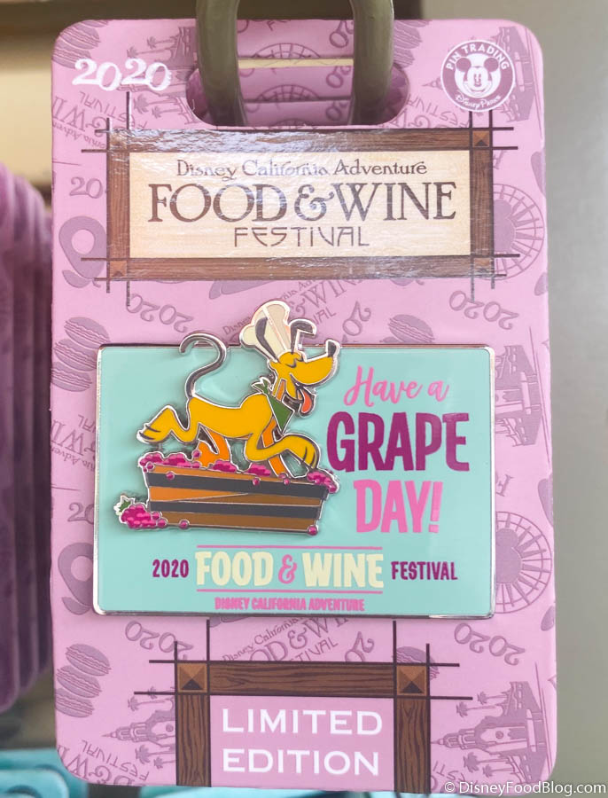 We spotted THREE collectible pins available at Pin Traders in Downtown Disney and we are oh-so-glad! After all, we can’t be the only ones who missed out on snagging these bad boys during Food and Wine in California Adventure! Here’s the Pluto Pin telling us to have a grape day!