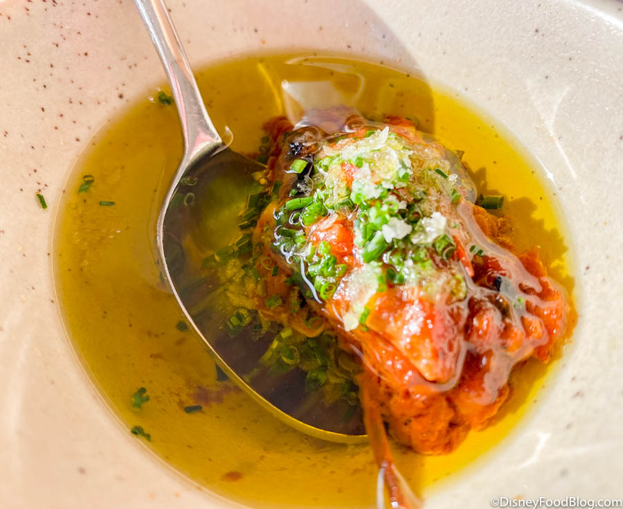 The soup itself is made with potato-celery root foam, garlic butter, and heirloom apple. It was very rich and very good. This was like traditional Beer Cheese Soup’s fancier Cali cousin!