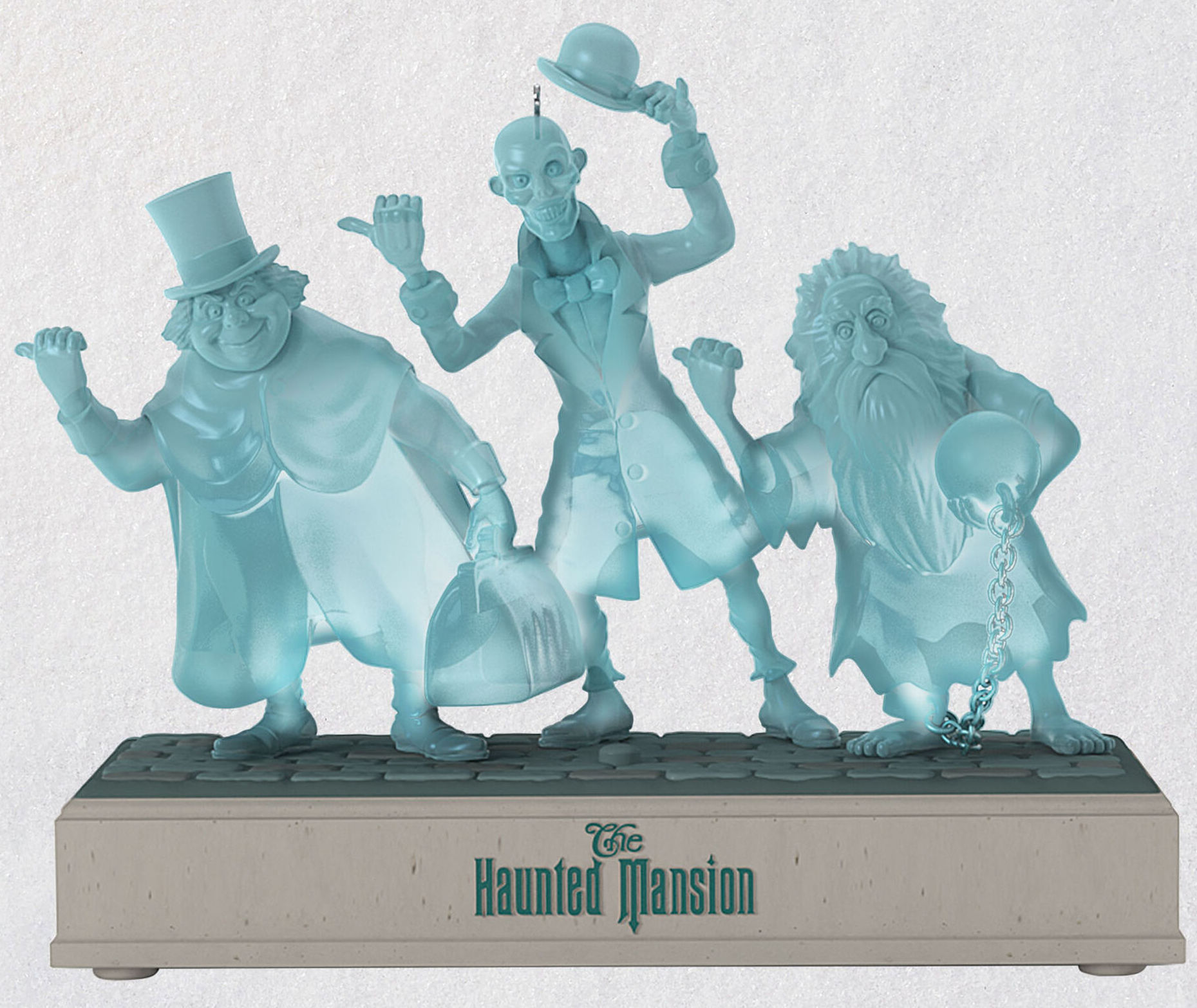 If this ornament senses your sympathetic vibrations as you press the button in the center, then it will truly begin to materialize! Our hitchhiking ghosts become colorfully illuminated, and that classic Haunted Mansion theme song will fill your ears!