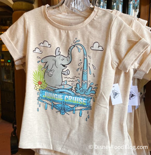 The shirt’s sleeves are folded back to give it a nice, clean look. The elephant tee is $24.99. Finally, another tee for the little ones that we discovered is this fun shirt featuring many of the animals you’ll encounter while adventuring on Jungle Cruise!