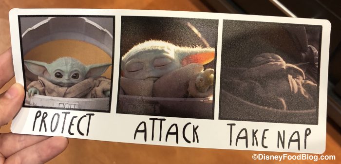 Get a triple dose of Baby Yoda with this Protect, Attack, Take Nap Magnet!
