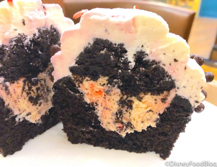 If youβre a big fan of peppermint flavor, this Christmas in July Cupcake packed a punch! The peppermint mousse filling was VERY minty (but we loved the contrast to the chocolate flavor). The whipped cream on top was a lot lighter, but still had a hint of that peppermint flavor. Plus, the peppermint bark added a nice crunch along with the chocolate crisps that kind of made us feel like we were snacking on a candy cane.