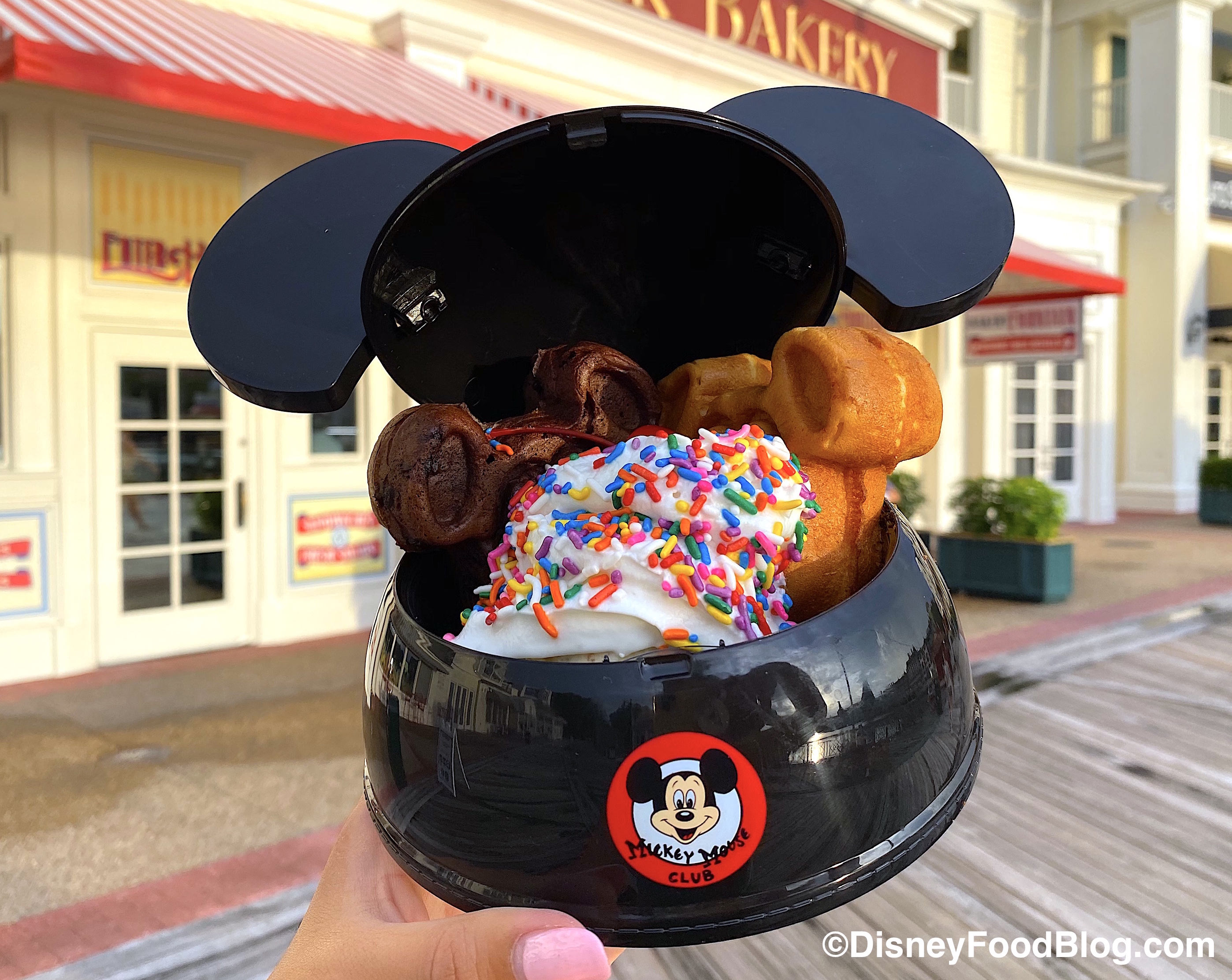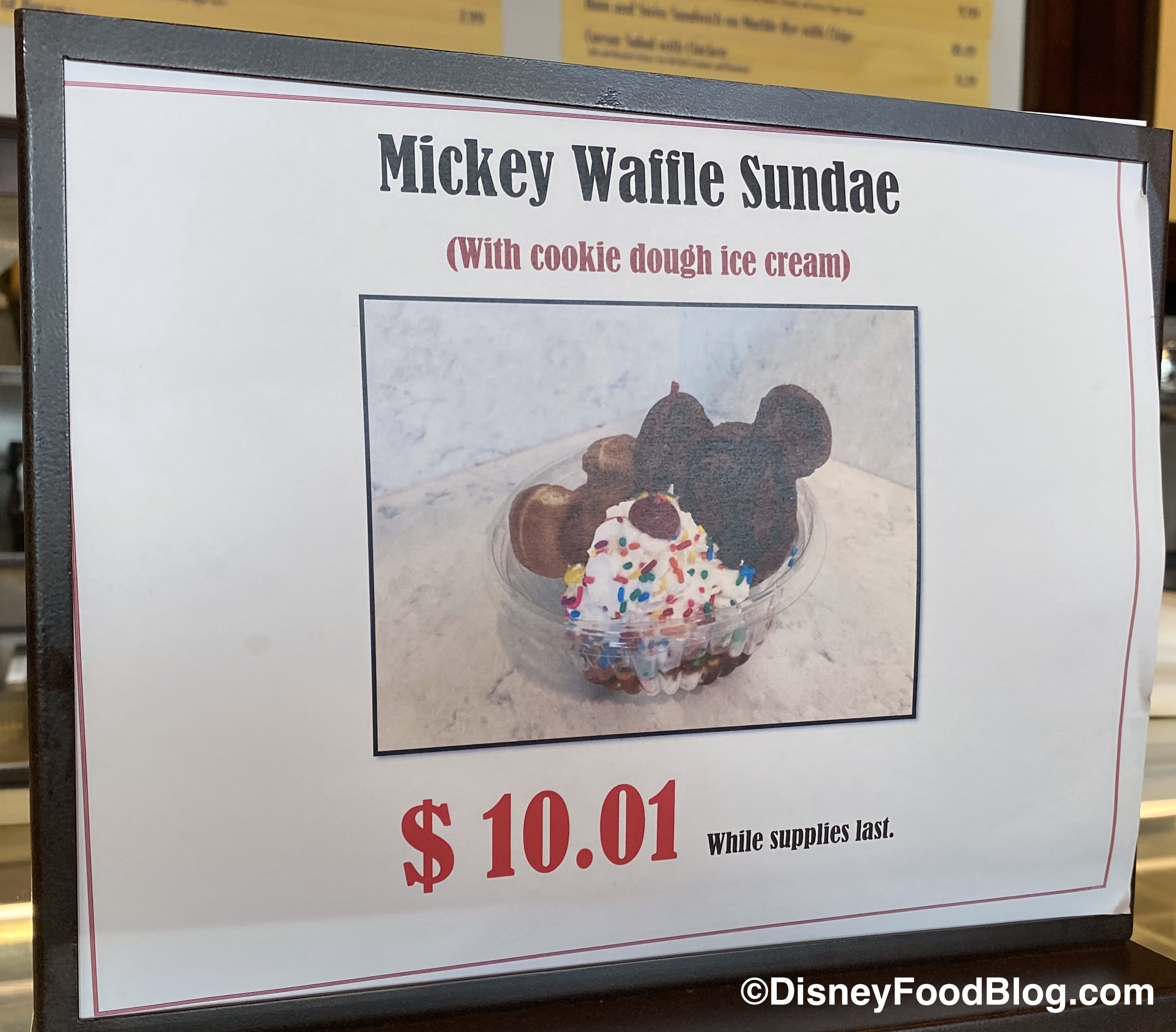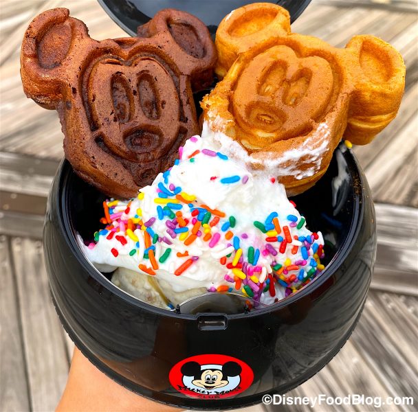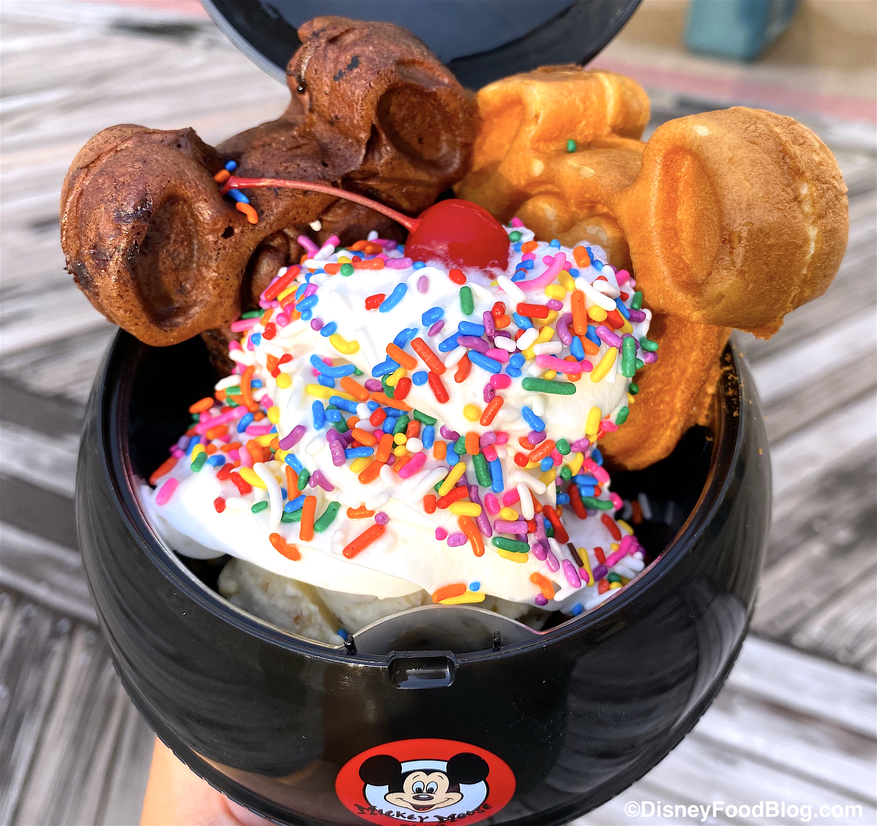 The sundae comes with one chocolate Mickey Waffle, one vanilla Mickey Waffle, cookie dough ice cream, whipped cream, sprinkles, and a cherry on top. In other words, the makings of a solid, classic sundae with an extra twist!