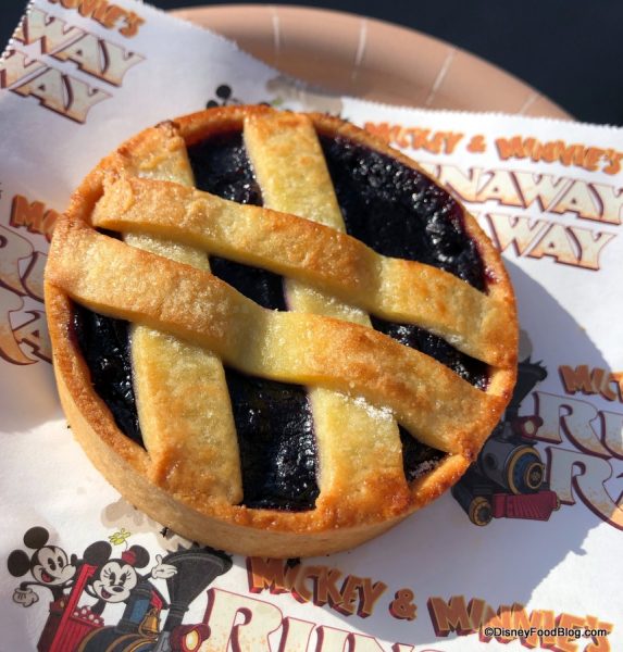 We’ve recently tried a few of these bb pies at the parks and resorts, including the tiny Blueberry Pie at the grand opening of Mickey and Minnie’s Runaway Railway.