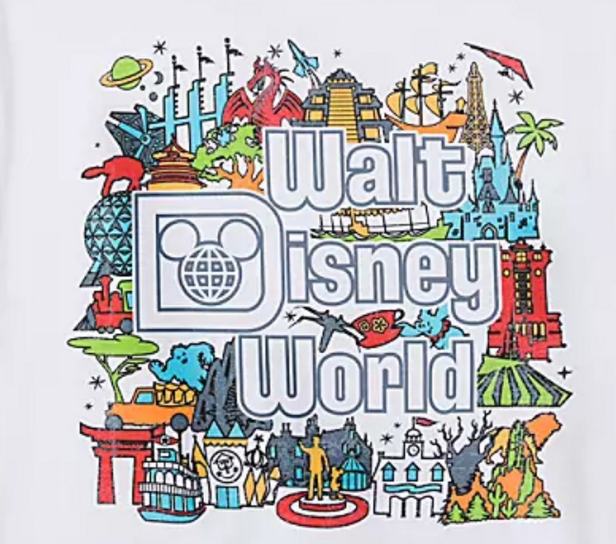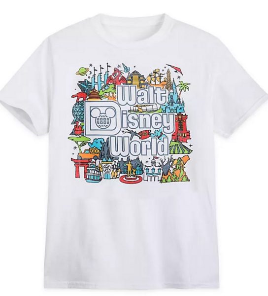 The whimsical design is echoed on the Walt Disney World Opening Days T-Shirt, with iconic attractions from all four parks represented on the front.