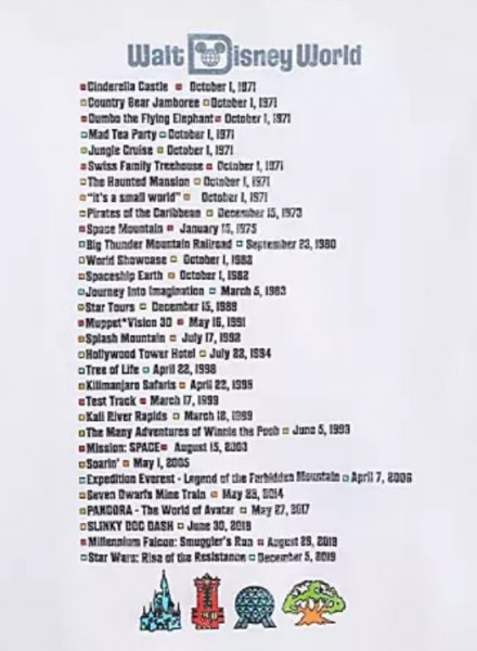 The back presents a list of Disneyland attractions with their opening days! From Sleeping Beauty Castle on July 17, 1955 to the Matterhorn Bobsleds on June 14, 1959 to the most recent addition of Star Wars: The Rise of the Resistance on January 17, 2020…