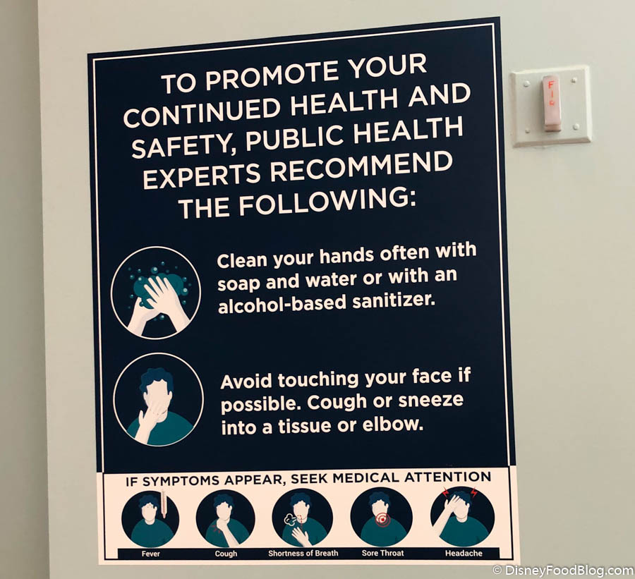 Speaking of signage, there was PLENTY. We spotted this one several times that encourages guests to keep their hands clean and keep an eye out for symptoms.