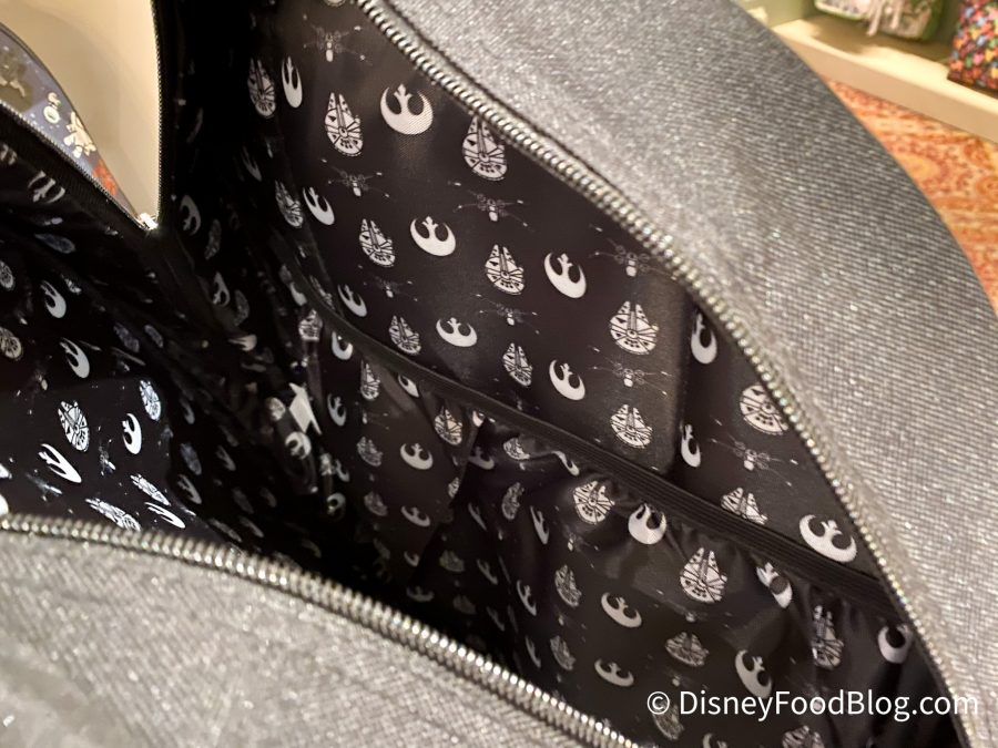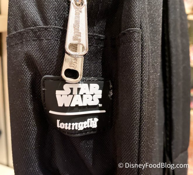 Star Wars and Loungefly logos are located on the side of this bag! It’s usually more prominently displayed on the backpacks, but because of the massive Millennium Falcon design, the logo got bumped to just below the zipper!