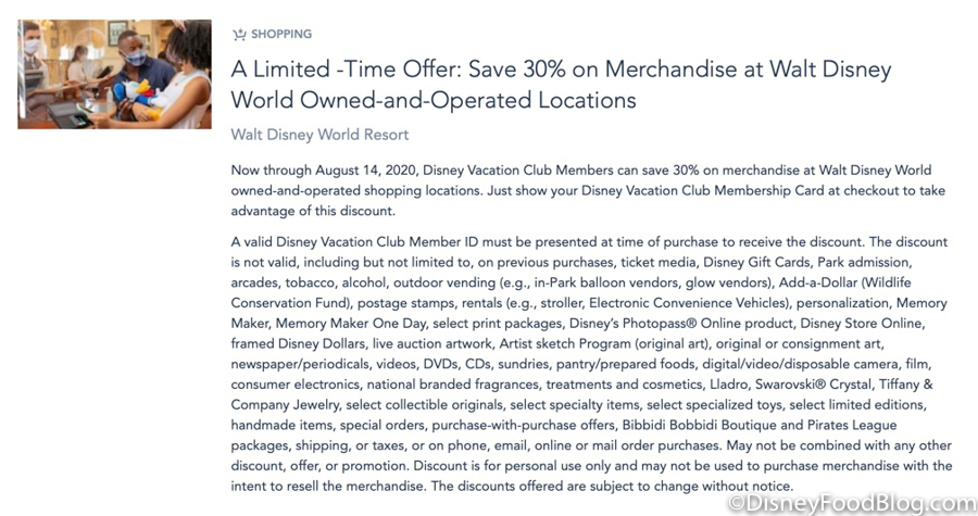 DVC Members can now get a 30% discount from all Disney-owned merchandise stores through August 14th. The 10% increase is now stated on the DVC offer website. Members must show their DVC member card and a photo ID to claim the discount.