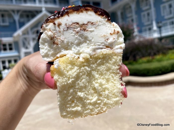 Of course, the chocolate topper isn’t actually hot fudge, but the chocolate frosting lends a bit of flavor variation to what is otherwise a classic vanilla treat, from the buttercream top to the soft cake base.