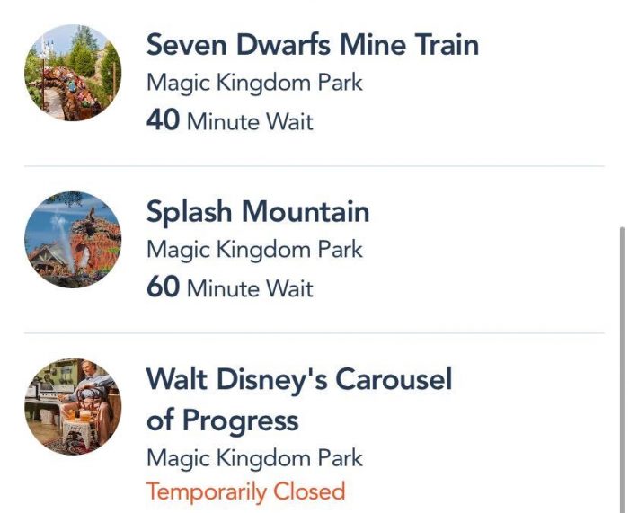 For the past two days, Carousel of Progress has not been running and has been marked as “Temporarily Closed” on the My Disney Experience app.