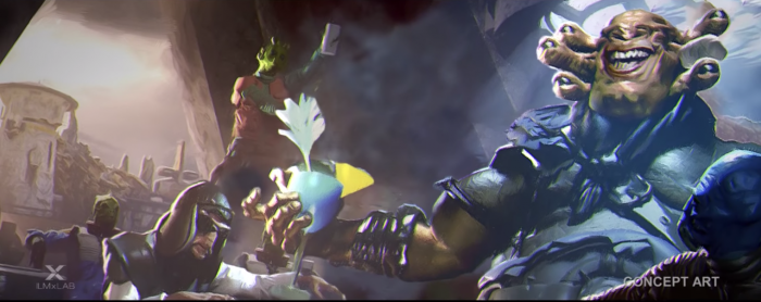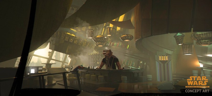 The new “Star Wars: Tales from the Galaxy’s Edge” virtual reality experience expands on the story of Batuu’s Black Spire Outpost with brand new characters and locations. One of the places shown in the concept art is Seezelslak’s Cantina, which is run by a six-eyed Azumel alien who overeats, acts a bit dramatic, and has a “love-hate relationship with porgs.”