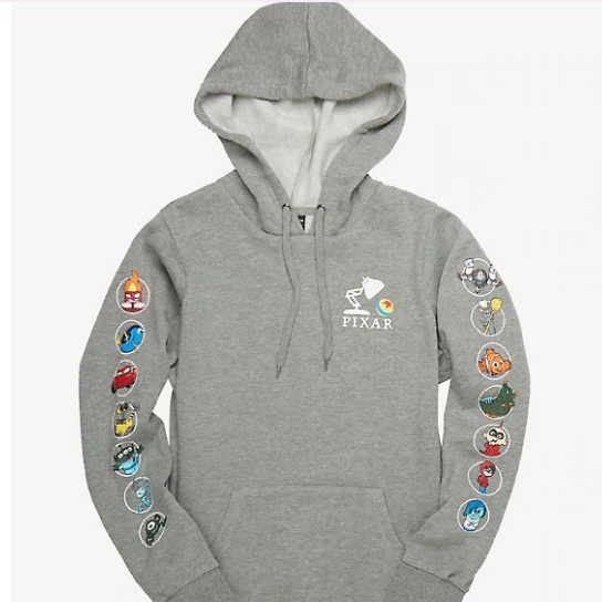 This grey hoodie looks oh-so-comfy and features both Luxo Jr. and the Luxo Ball on the front, and has our favorite Pixar friends down the sleeves. You’ll love wearing Buzz Lightyear, Lightning McQueen, and Dory all day long. This also comes in regular and plus, with the regular hoodie priced at $44.90 and the plus hoodie priced at $49.90.