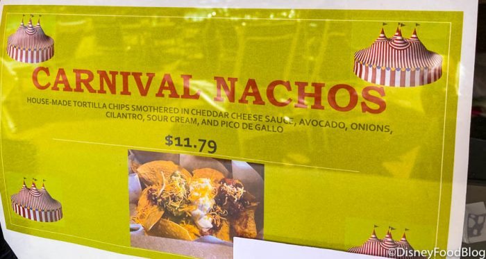 The new Carnival Nachos feature house-made tortilla chips covered in cheddar cheese sauce, avocado, onions, cilantro, sour cream, and pico de gallo. And although the sign didn’t mention it, extra-fine shredded cheese was added to the top of our Carnival Nachos for good measure — not that we minded!