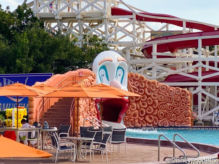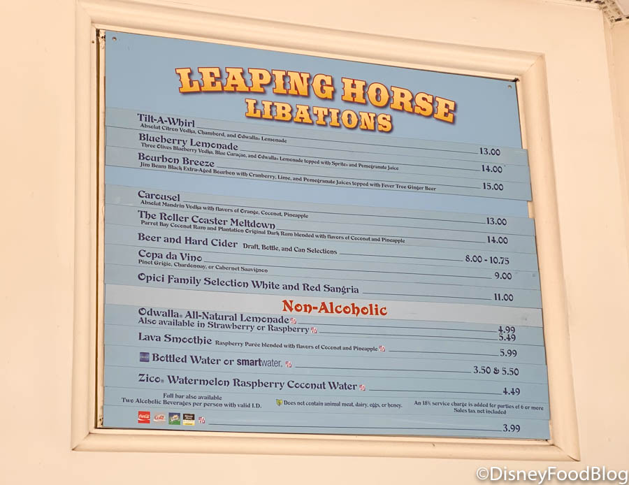 Even though the reopening date of Disney’s BoardWalk Inn has been pushed back, the Disney Vacation Club rooms are currently open! And that means the Luna Park Pool has plenty of hungry swimmers that need feeding! Today we saw the usual selection of cocktails and non-alcoholic drinks on the menu at the pool bar, Leaping Horse Libations.