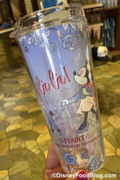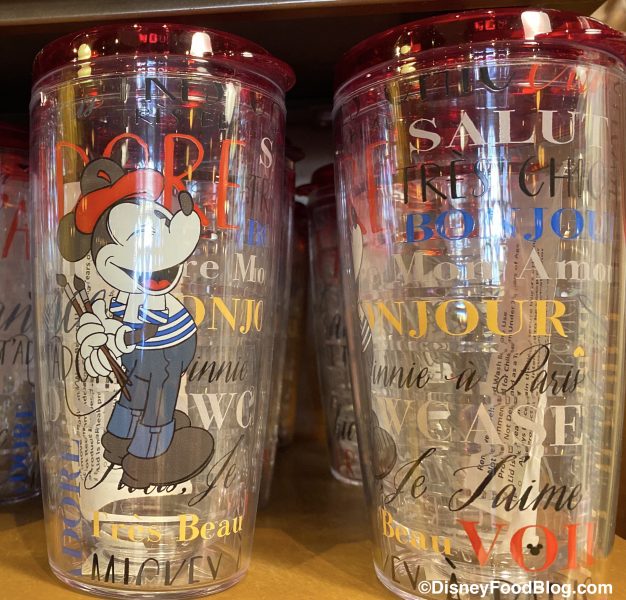 You can practice your French with all of the phrases printed on this Mickey Tumbler, priced at $19.99!