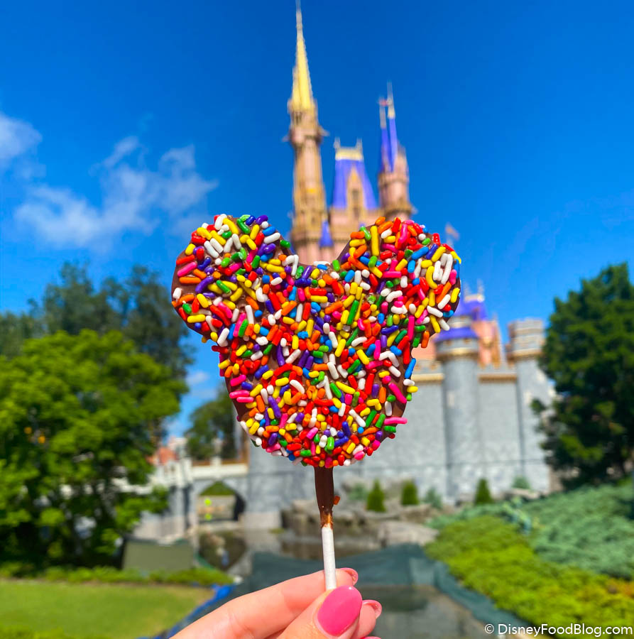 At first glance, this treat definitely looks like a classic Mickey Rice Krispie, but it’s actually VERY different. You’re looking at a Mickey-shaped Marshmallow on a stick covered in chocolate and sprinkles. Okay, okay, you’ve got our attention!