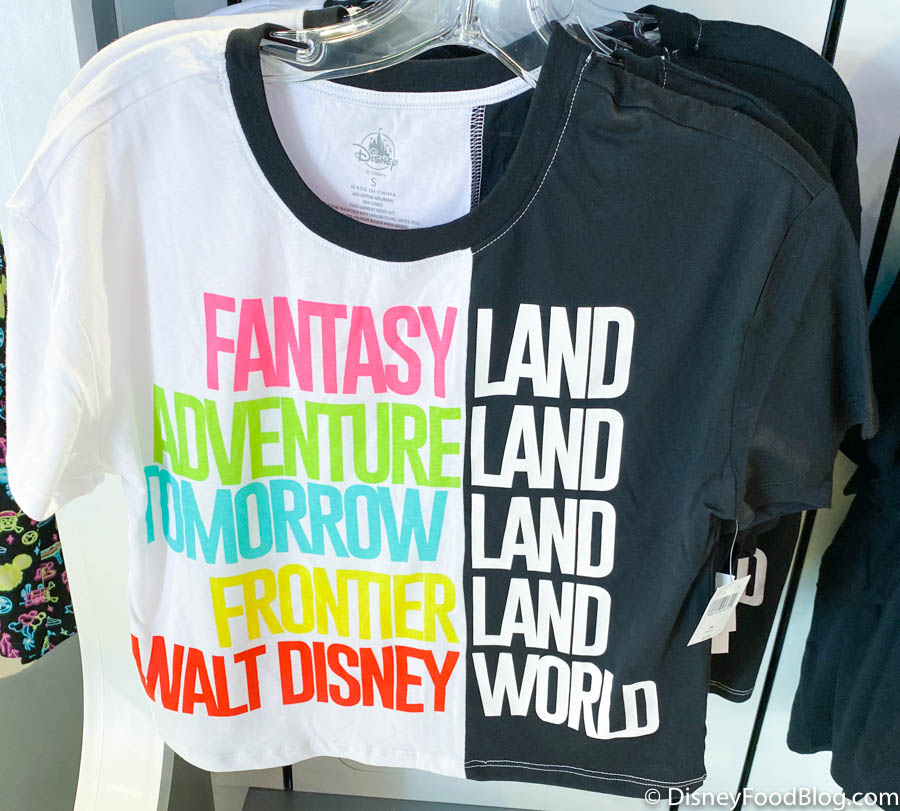 This tee honors the many lands of Magic Kingdom! We’re really digging the cool black and white background effect going on here!
