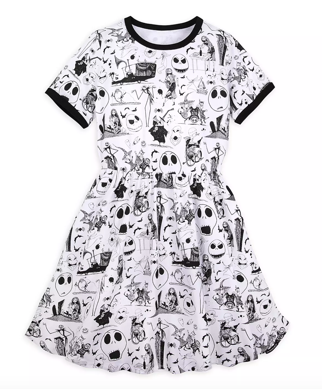 We love how the dress’s graphic black and white print features some of our favorite characters from the film! Sally, the Mayor, Lock, Shock, Barrel, Oogie Boogie, Zero, and even the Pumpkin King himself all make an appearance!