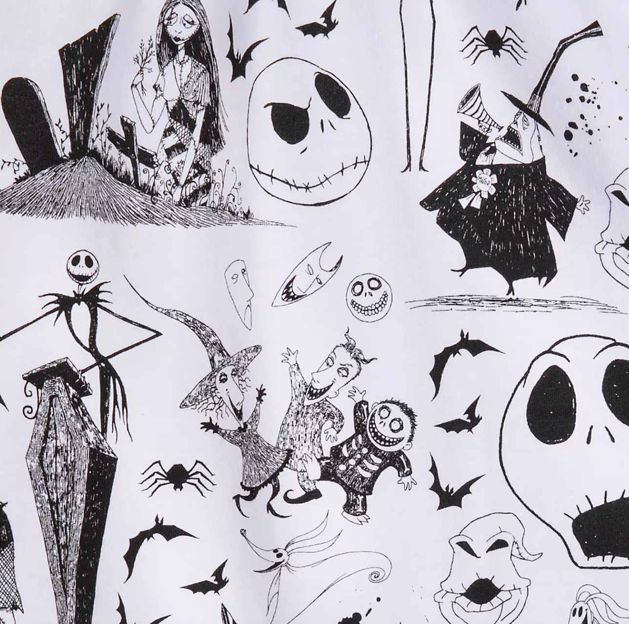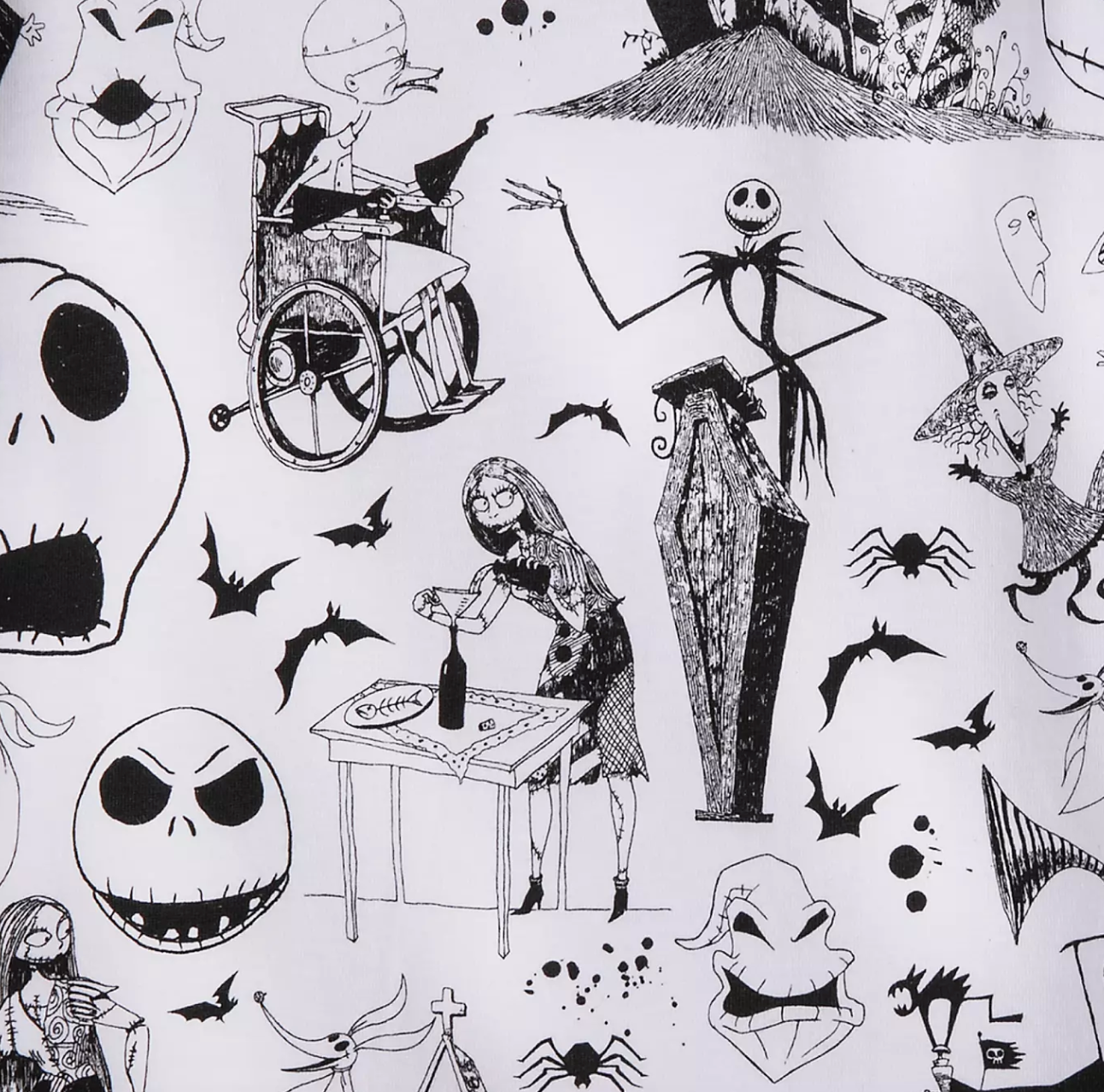 Just when you think you’ve spotted all the characters, you’ll find EVEN more of them hidden in this intricate pattern! Here’s another section of the print that features Sally’s creator Dr. Finkelstein and more artwork featuring the rest of the Nightmare gang!