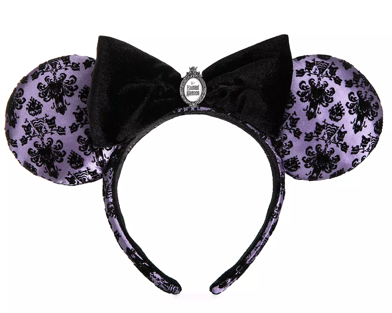 As you can already see from the photos, the new Haunted Mansion Wallpaper Minnie ears are absolutely STUN-NING! Each ear is made of shimmery purple satin and is flocked with the iconic Haunted Mansion design! They’re then finished with a black velour bow and Haunted Mansion embellishment at their center!