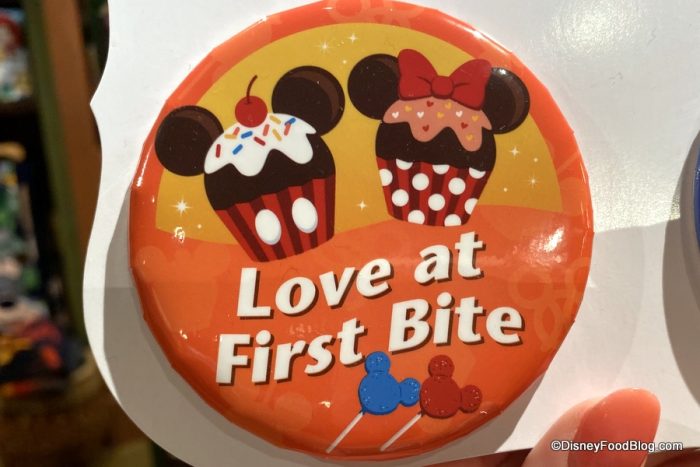 You’ll find a Mickey and Minnie Cupcake represented on the “Love at First Bite” button.