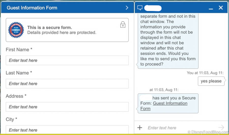 If you did receive an email link for canceling your Pass, you can use it. If not, let the Cast Member in chat know. We were directed to a secure Guest Information Form that popped up alongside the chat window. Once we filled it out with our basic contact info and email address used for My Disney Experience, the Cast Member could submit our request to cancel our Pass. It was that easy! No lengthy hold time on the phone and no panicking because the call won’t go through.