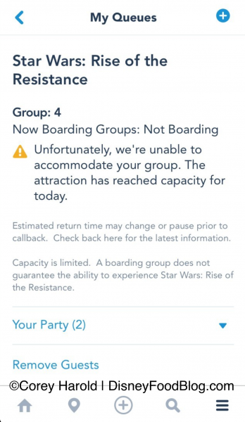 We noticed that Star Wars: Rise of the Resistance and Muppet*Vision 3D had both been listed as “Temporarily Closed” on My Disney Experience today. Now, it looks like Rise of the Resistance will likely be closed for the rest of the day. In My Disney Experience where it typically lists the groups that are currently being boarded for the attraction at the moment, it now states “Now Boarding Groups: Not Boarding.” Thanks to reader Corey Harold for sending us the screenshot below.