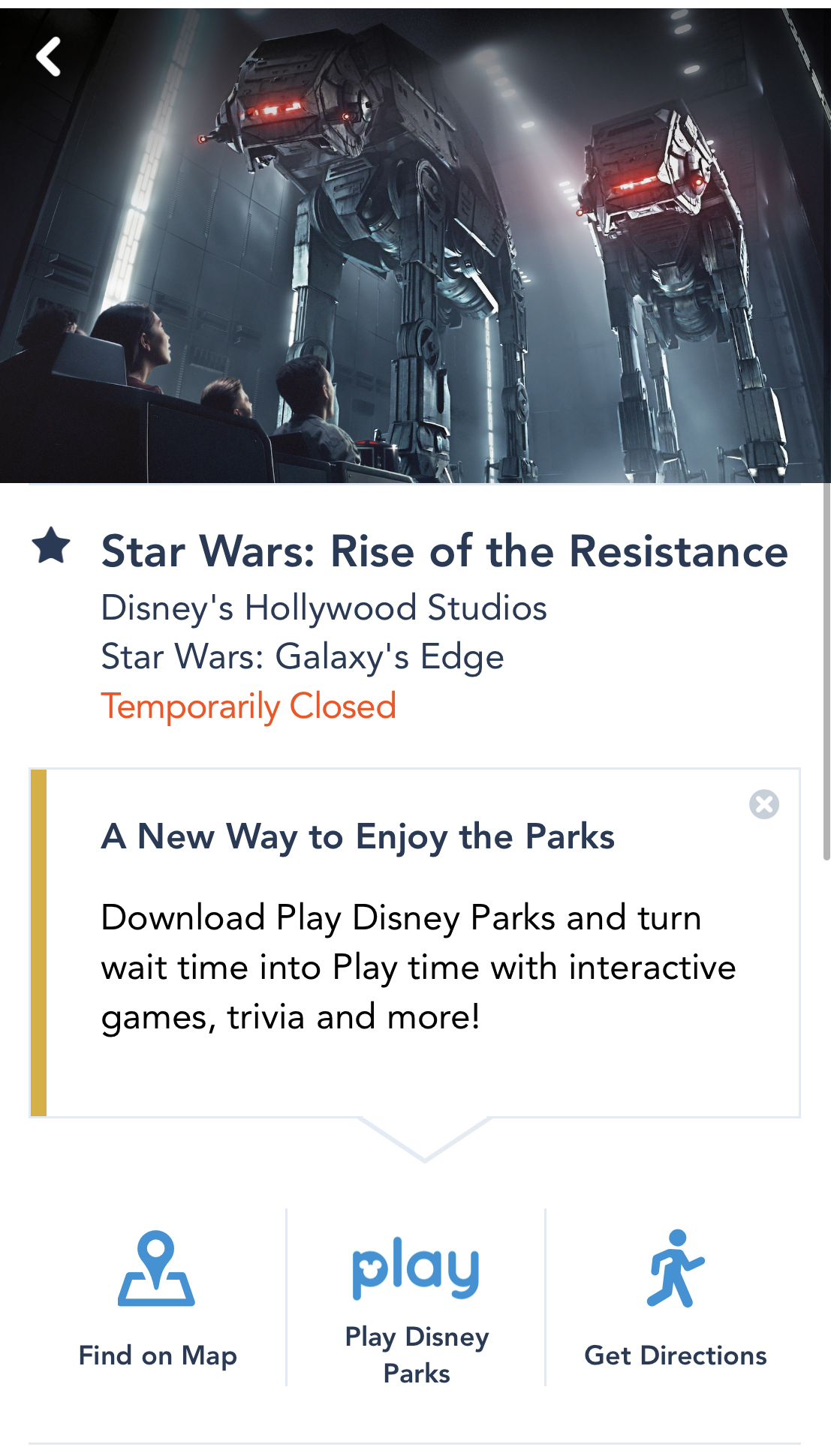 We’ve noticed that Star Wars: Rise of the Resistance has been temporarily unavailable throughout the day today. We checked around 2:40PM ET and it still appeared as “Temporarily Closed” in My Disney Experience.