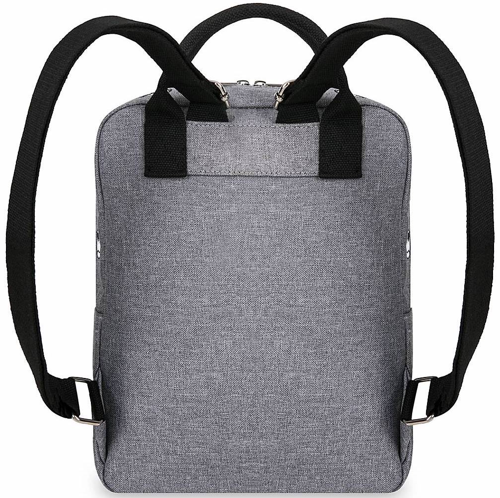 This gray canvas backpack has a top carry handles as well as adjustable shoulder straps. Cute and versatile — love it!