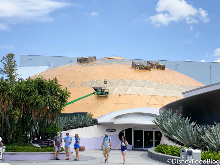 A few months ago, Disney filed permits for work that will take place inside the pavilion. Today, we saw active work taking place outside. As we approached the building, we could see construction workers working on the roof of the structure! They have even removed one of the triangle panels, leaving what looks to be a hole in the building.