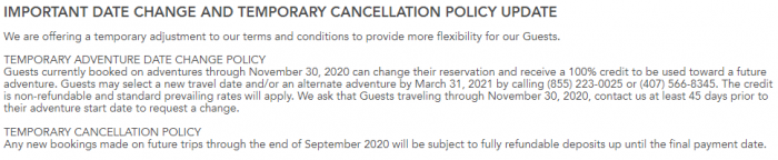 The updated policy states, “Guests currently booked on adventures through November 30, 2020 can change their reservation and receive a 100% credit to be used toward a future adventure.” As a reminder, new dates must be chosen by March 31st by calling (855) 223-0025 or (407) 566-8345.