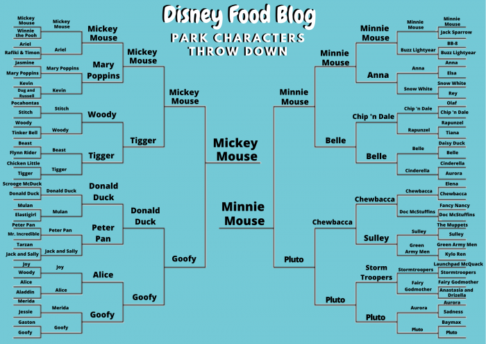 The choice may be tough, but it’s YOURS!! You can wrap up your picks with the printable bracket and by voting on our Instagram in the LAST round tonight! Once we’ve figured out which character has won the bracket, we’ll announce which mouse will reign supreme.