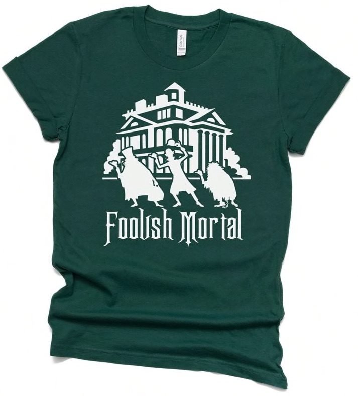 If you’re ready to join the happy haunts, and need more Haunted Mansion gear to go along with your LOADS of other Haunted Mansion merchandise, then you’ll love this Foolish Mortal design, featuring the Hitchhiking Ghosts, with the Mansion looming in the background.