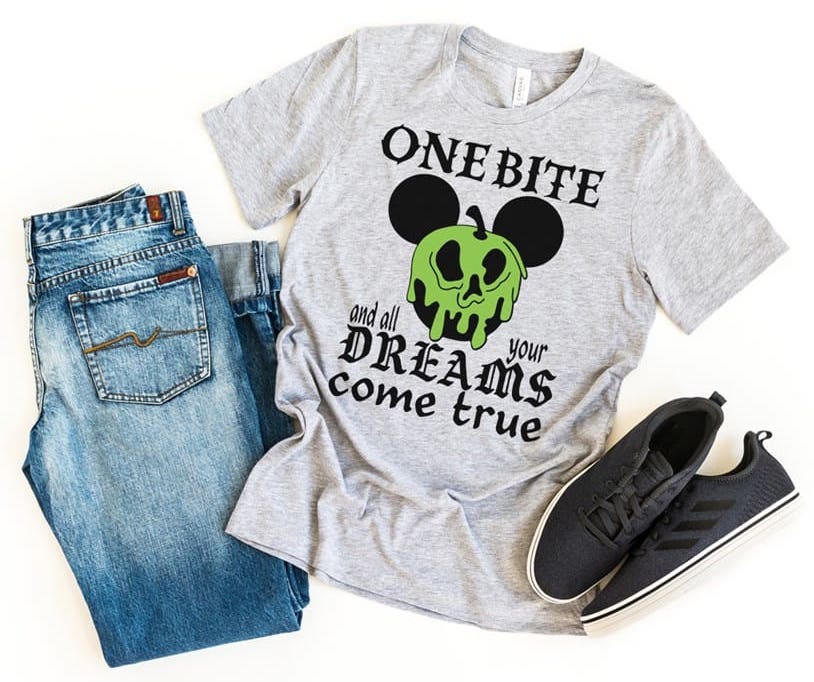 Want to make all of your dreams come true? Well, maybe you shouldn’t go around eating apples from strangers, but you can wear this fun One Bite and All Your Dreams Come True shirt, with a poisoned Mickey apple on it!