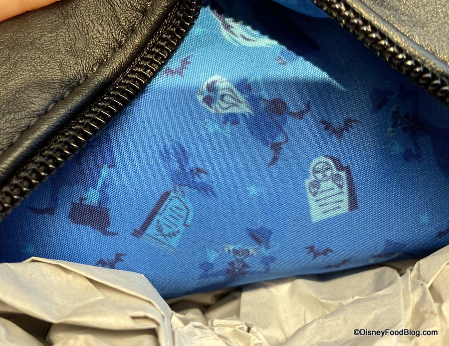 All three are riding along on the Doom Buggy that forms this smaller Hitchhiking Ghosts Loungefly Crossbody Bag, and you’ll find a few more Happy Haunts inside…