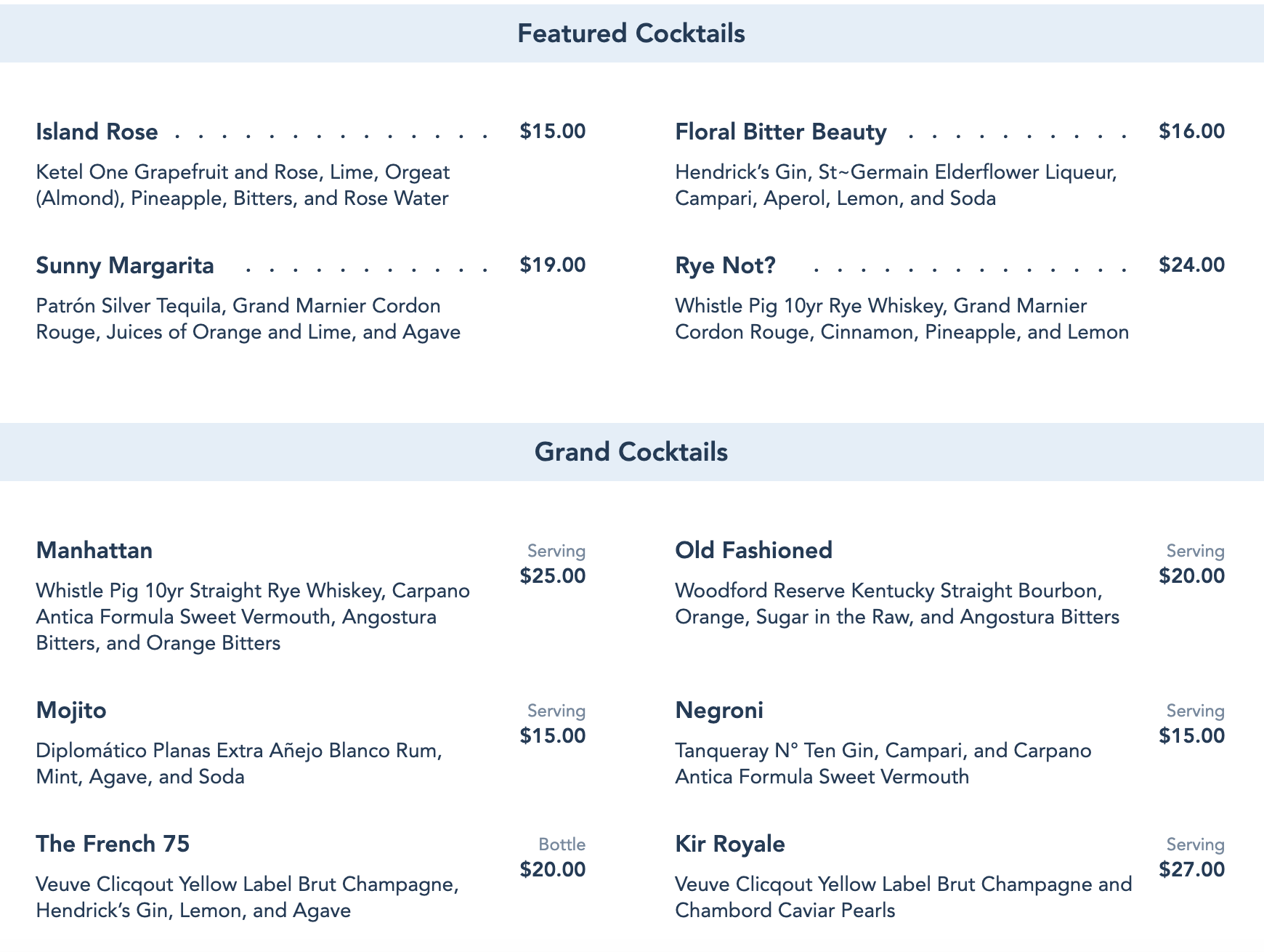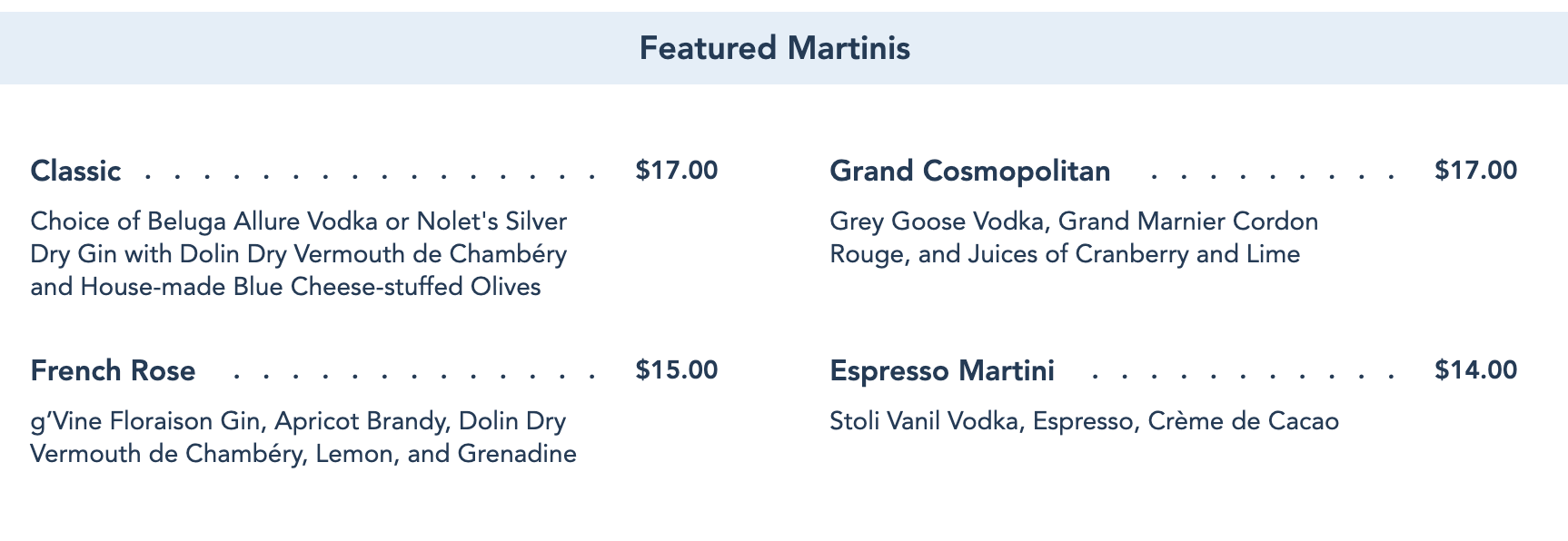 Enchanted Rose currently has four Featured Martinis. Note that the tableside prepared cocktails are currently on hold, but if you’re visiting when they return, they’re a LOT of fun to watch being prepared, and they definitely have a storyline to them.