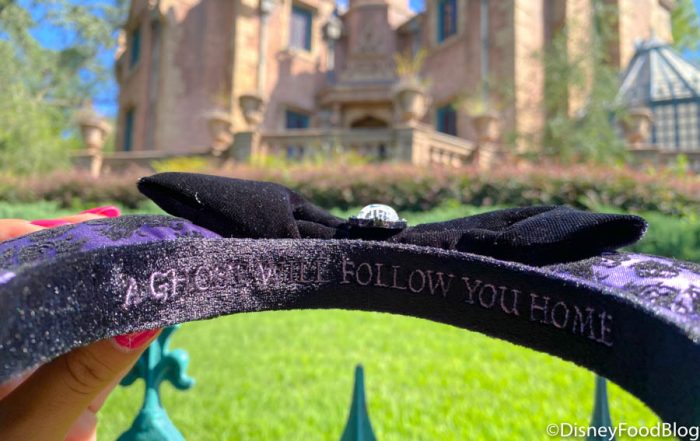 They’re also embellished with a velour bow at the center and adorned with a mini “Haunted Mansion” plaque!