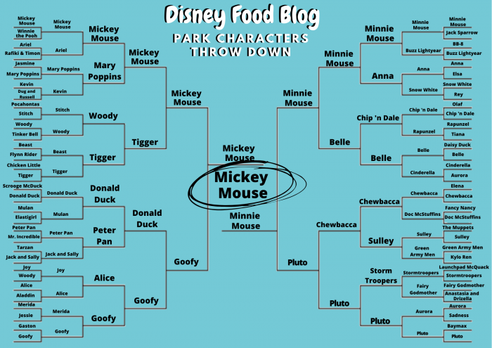 That’s right — as we live and breathe, Mickey and his lady love Minnie went head-to-head in the final round of our official Disney Food Blog Park Characters Throw Down last night, and now we’ve just tallied the final votes!
