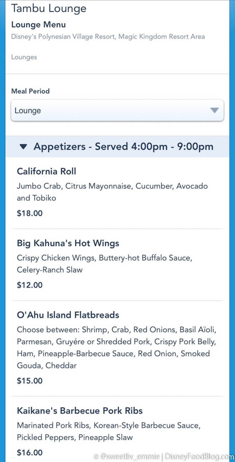 And, thanks to our reader, @sweetliv_emmie on Instagram, we were able to get a first look at the reopened lounge! While Tambu Lounge will be serving both drinks and appetizers, the menu has been limited to bites like the California Roll, Big Kahuna’s Hot Wings, O’Ahu Island Flatbreads, and Kaikane’s Barbecue Pork Ribs.