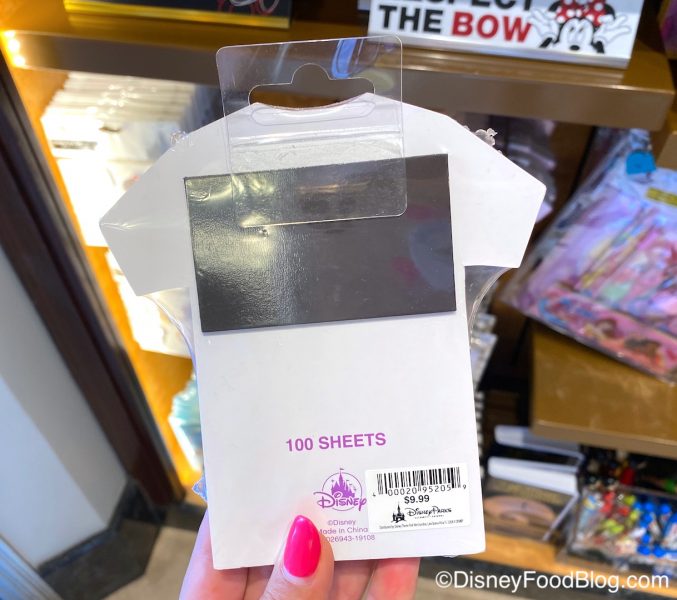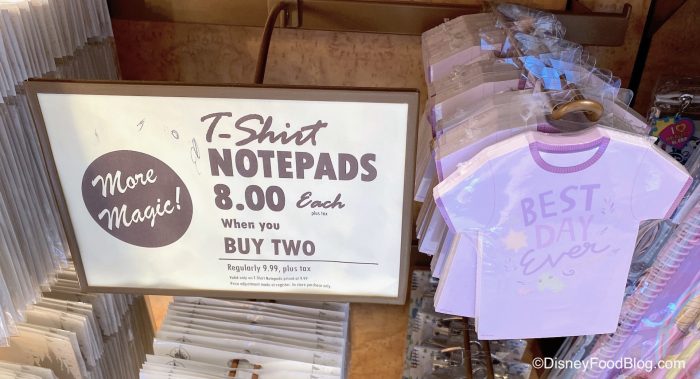 Some people collect ears. Others collect Loungefly bags. Us, we’re partial to the world of notepads inexplicably shaped like t-shirts. Okay, maybe we don’t have a t-shirt notepad collection, but now that you’ve heard of them, they sound cute, right? Well, earlier today we stopped by The Darkroom, a merchandise store located toward the front of Hollywood Studios. We noticed that t-shirt notepads were actually on sale there for $8.00 each when you buy two. It’s random enough that the sale was only for t-shirt notepads (not stationary or notepads in general), but here’s the other weird thing…