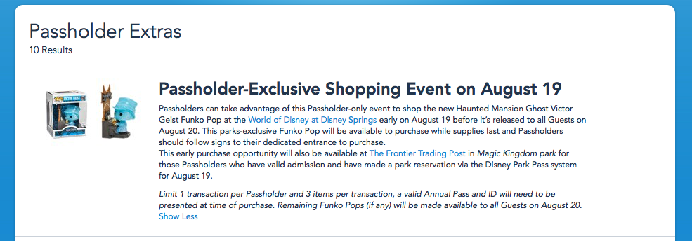 Passholders may only make 1 transaction as part of this exclusive event and sales will be limited to 3 items per transaction. You must present a valid Annual Pass as well as a valid form of identification at the time of purchase. Of course, Passholders will only be able to get one of these special items while supplies last. Any Funko Pops! that remain will then be made available to all guests on August 20th.