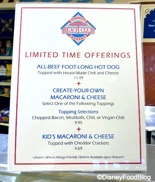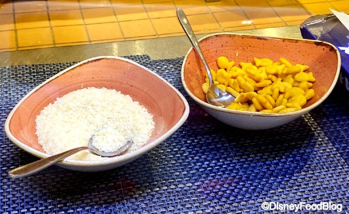 We also spotted that there is a Kid’s Macaroni and Cheese on the menu, featuring a fan-favorite topping from The Garden Grill over at EPCOT. Oh yes, we spotted goldfish crackers!!!