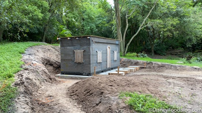 As it is near the end of the ride, I could see it as some type of outpost where animatronic figure could be placed waving goodby to travelers passing by. Maybe they are going to revive an updated version of the original story track that went with the safari similar to the shrunken head chief at the end of the Jungle Cruise attraction. Interesting that the cement pads out front of the building are quite robust and should hold. Considerable amount of weight.