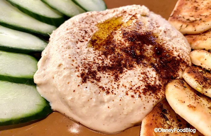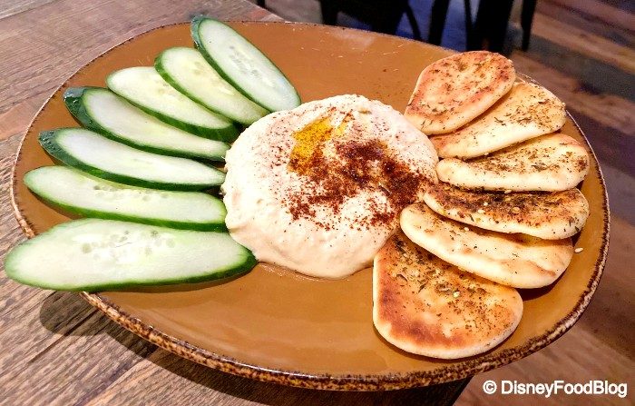 Because we love to snack (duh, have you MET us?!), we opted for a few small plates on this visit. Our first small plate was the Hummus, which is topped with olive oil and chipotle and served with cucumbers and naan bread.